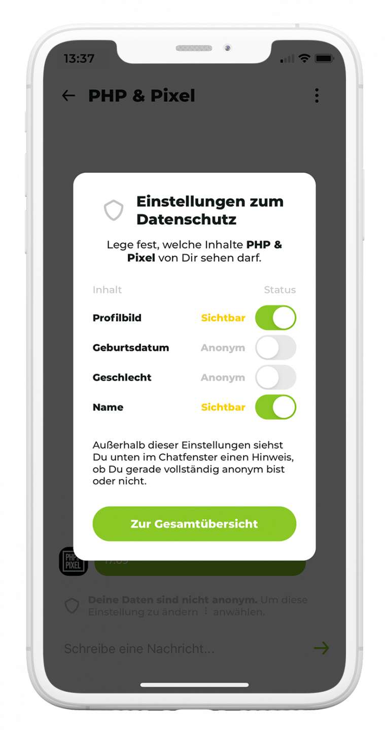 Aus diesem Grund bist du jederzeit anonym, solange du das sein möchtest. Du kannst für jedes Unternehmen separat die Sichtbarkeit von Inhalten wie Name, Geschlecht, Profilbild und vieles mehr einstellen.